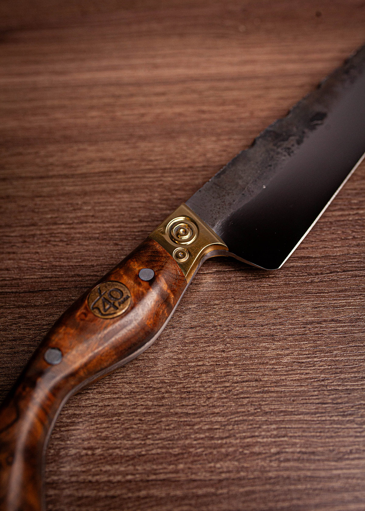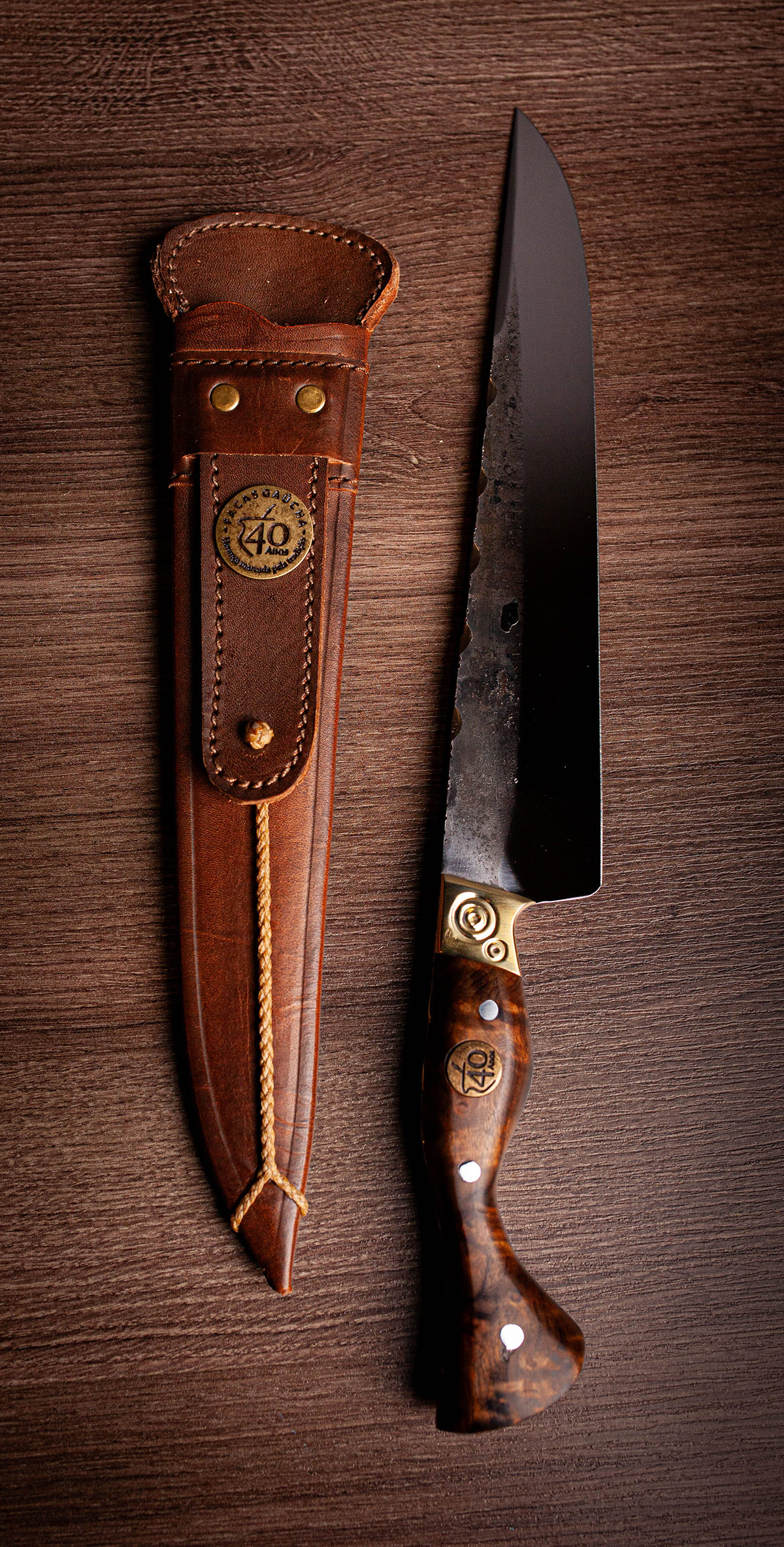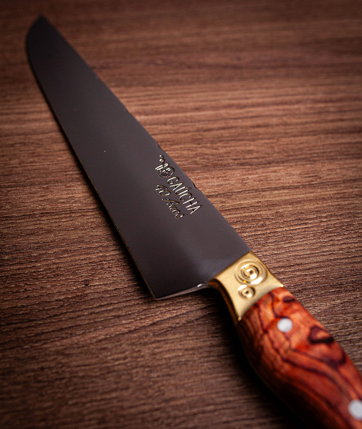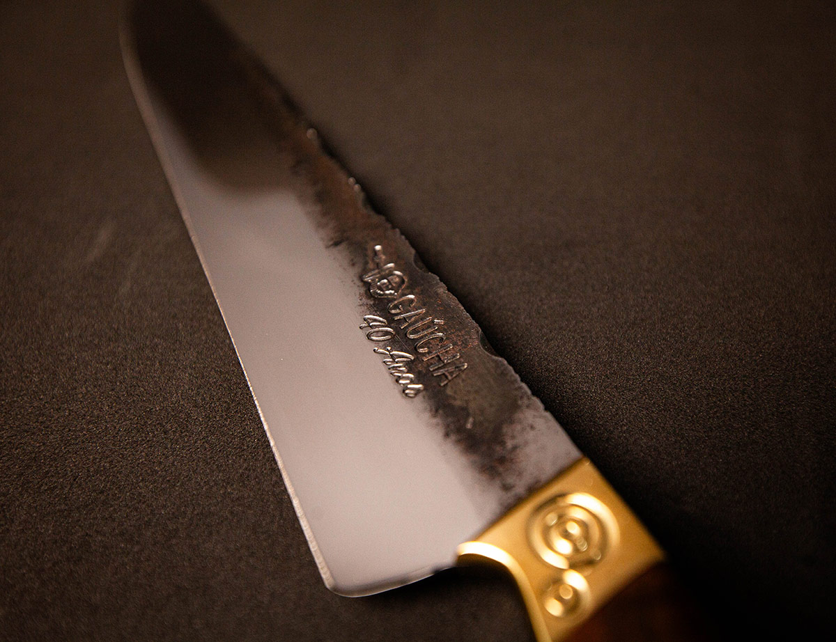 Acabamento Brut Forj com dorso mosqueado e cabo em Imbuia. A rusticidade e o corte clássico da tradição.