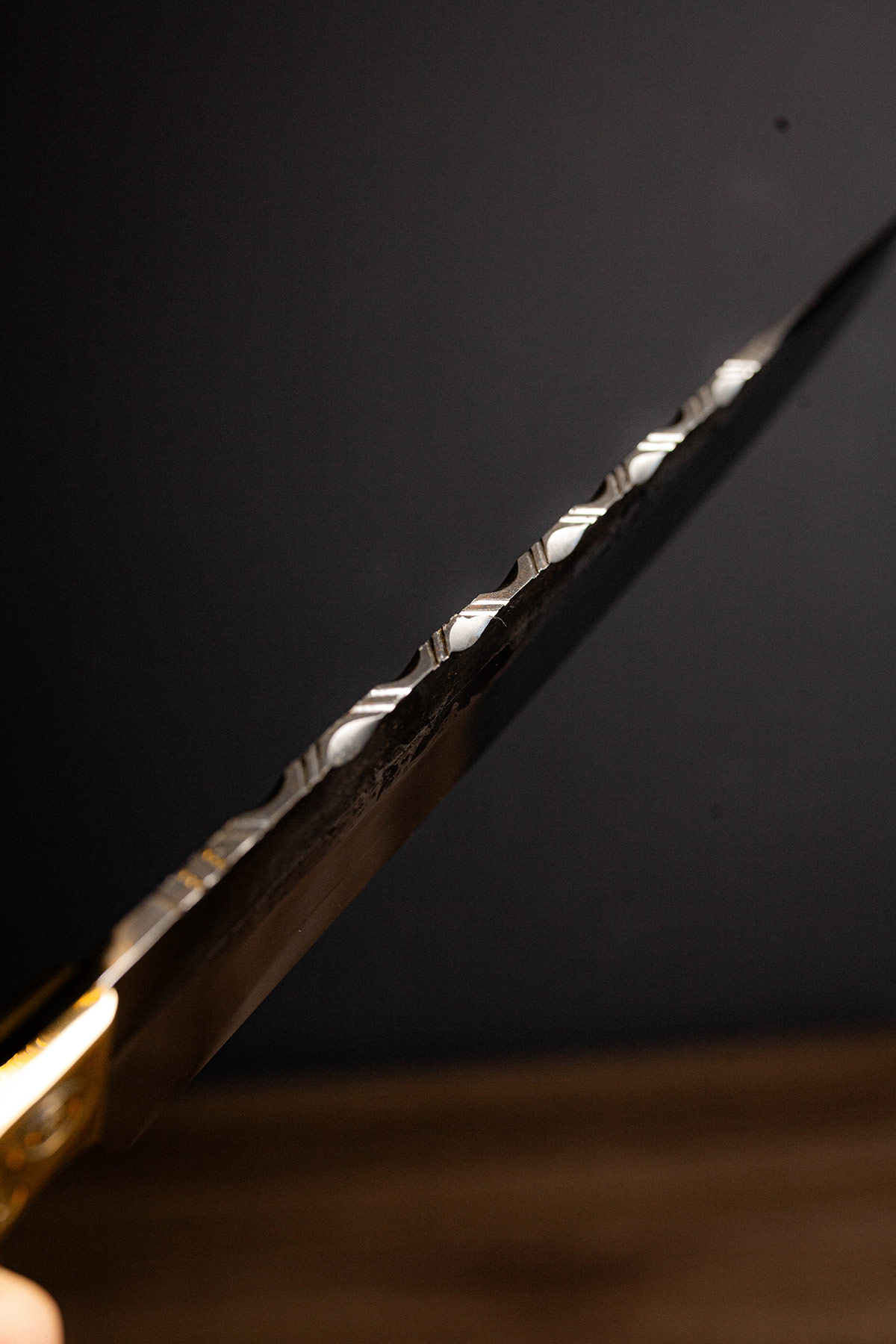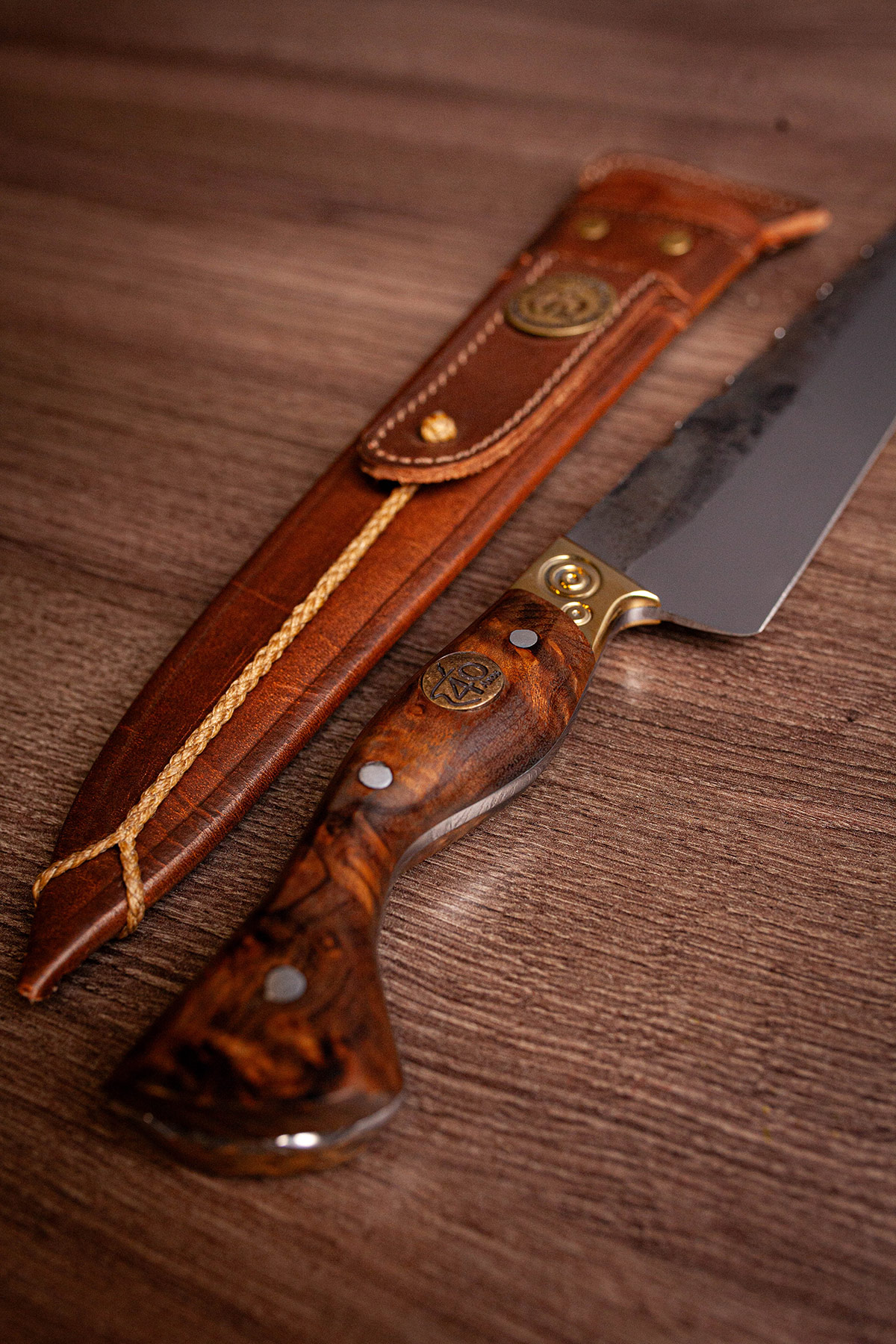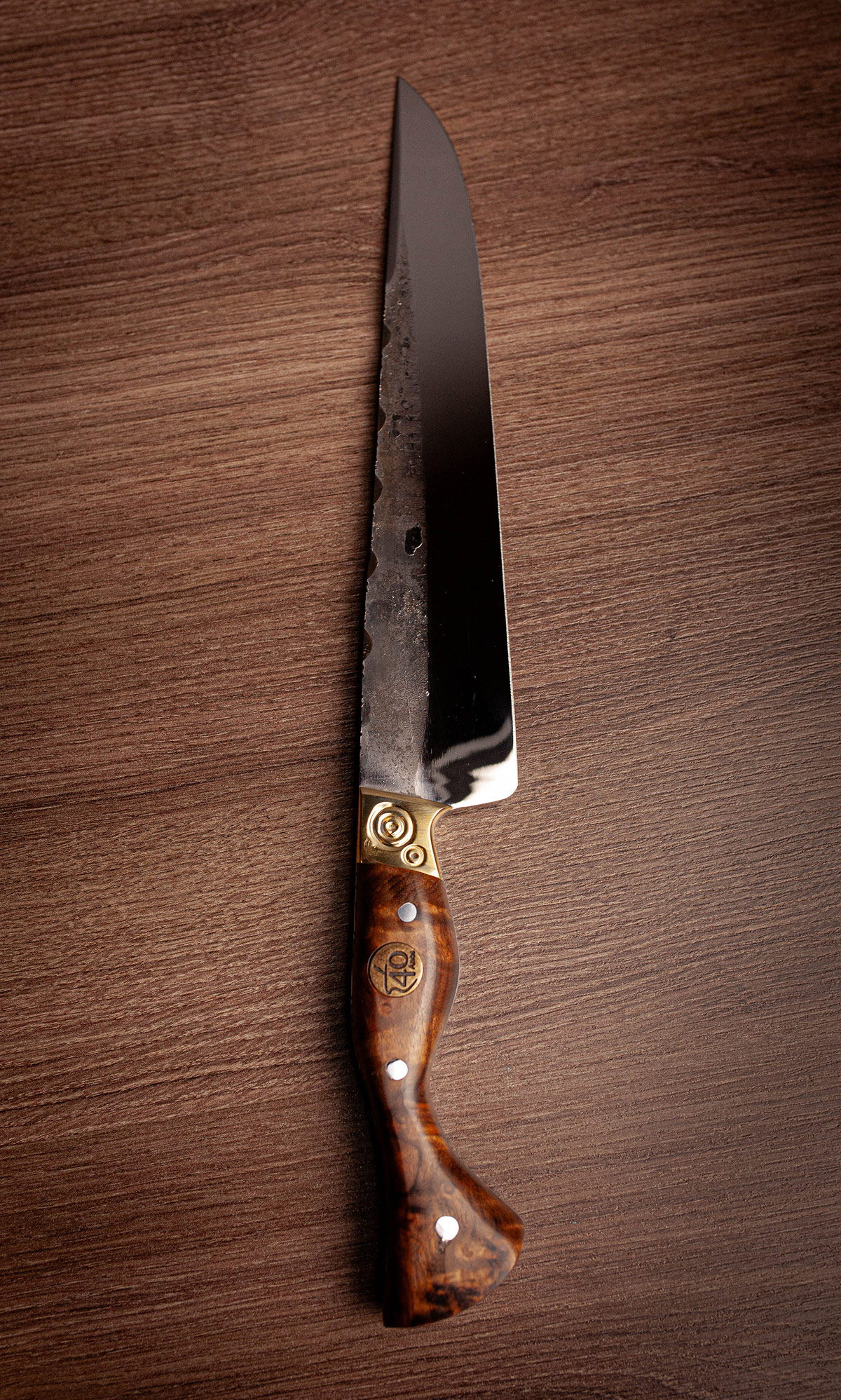 Acabamento Brut Forj com dorso mosqueado e cabo em Imbuia. A rusticidade e o corte clássico da tradição.