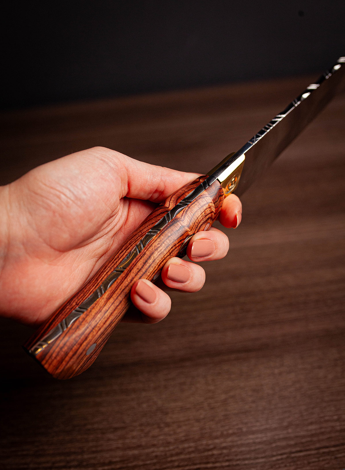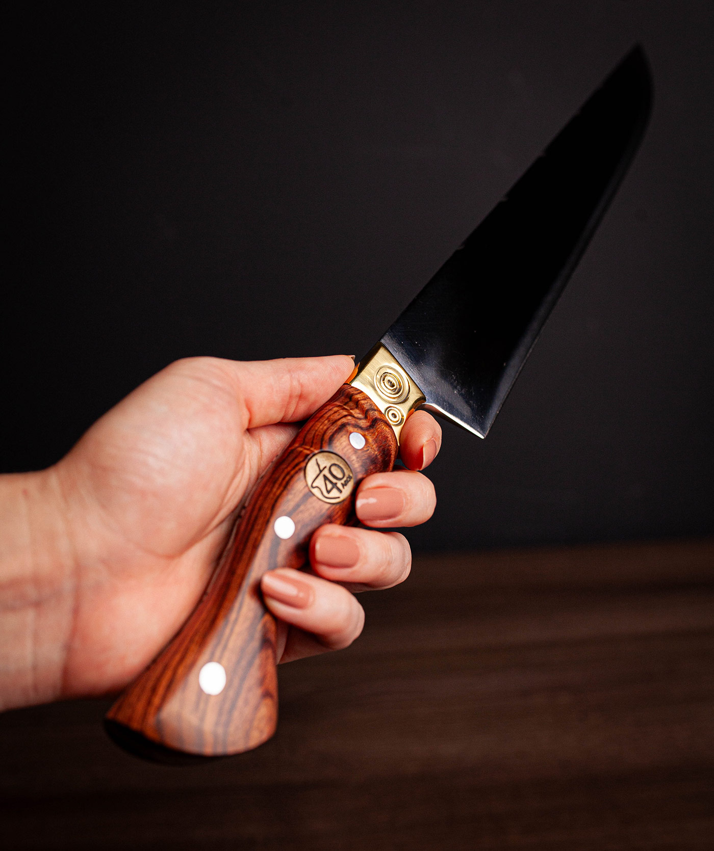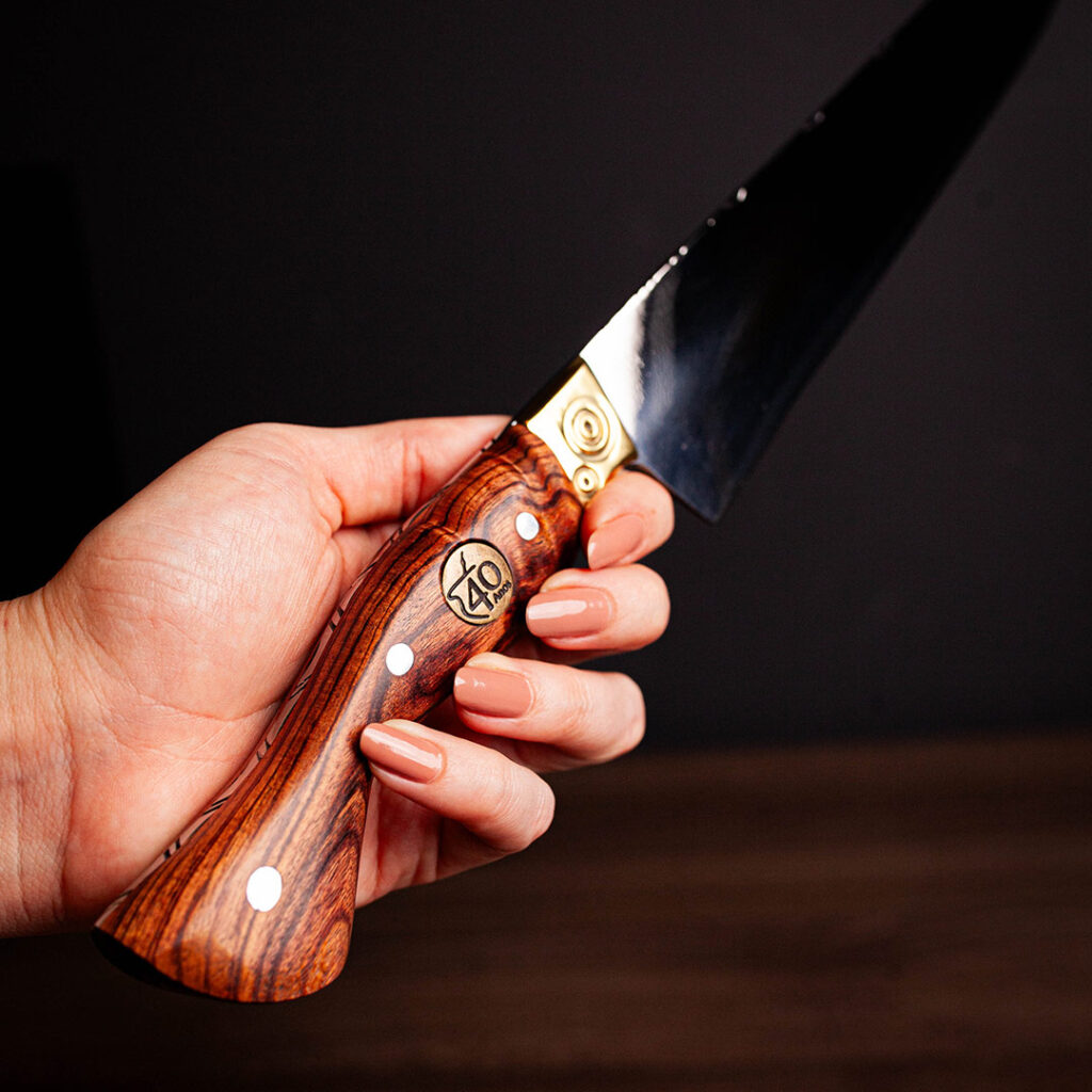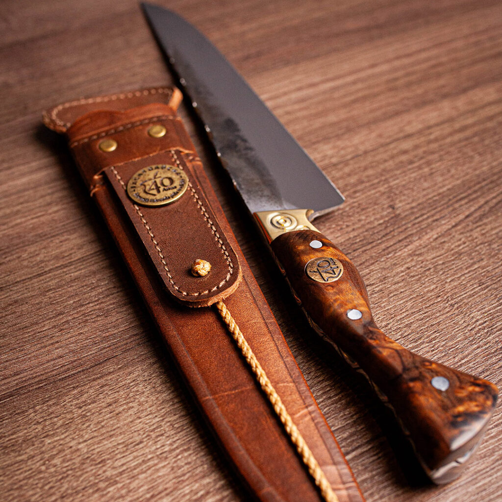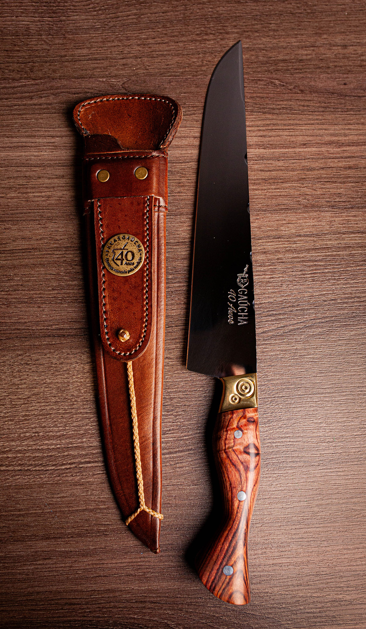 Acabamento espelhado, design Full Tang e cabo em Jacarandá. Elegância, resistência e brilho superior.