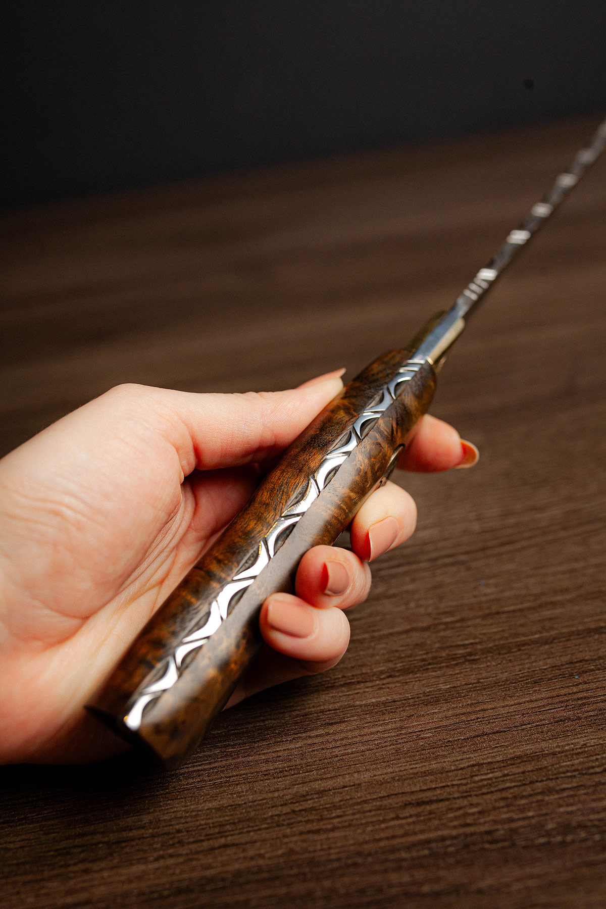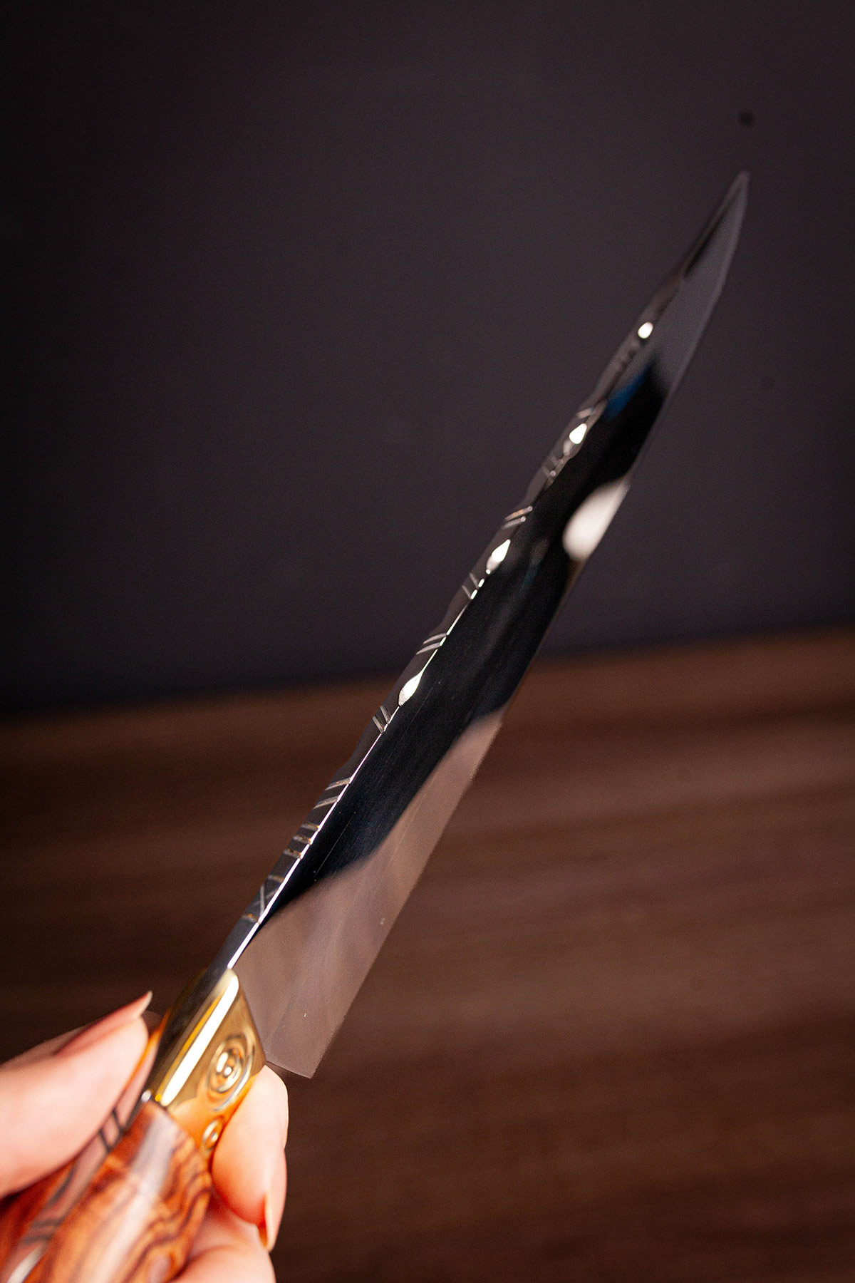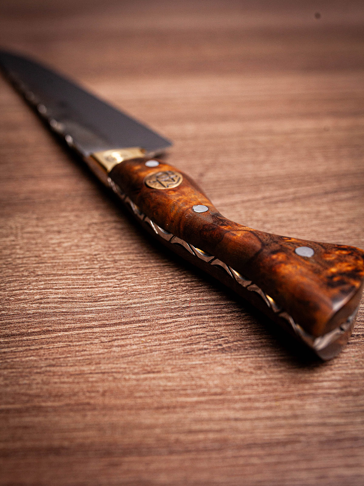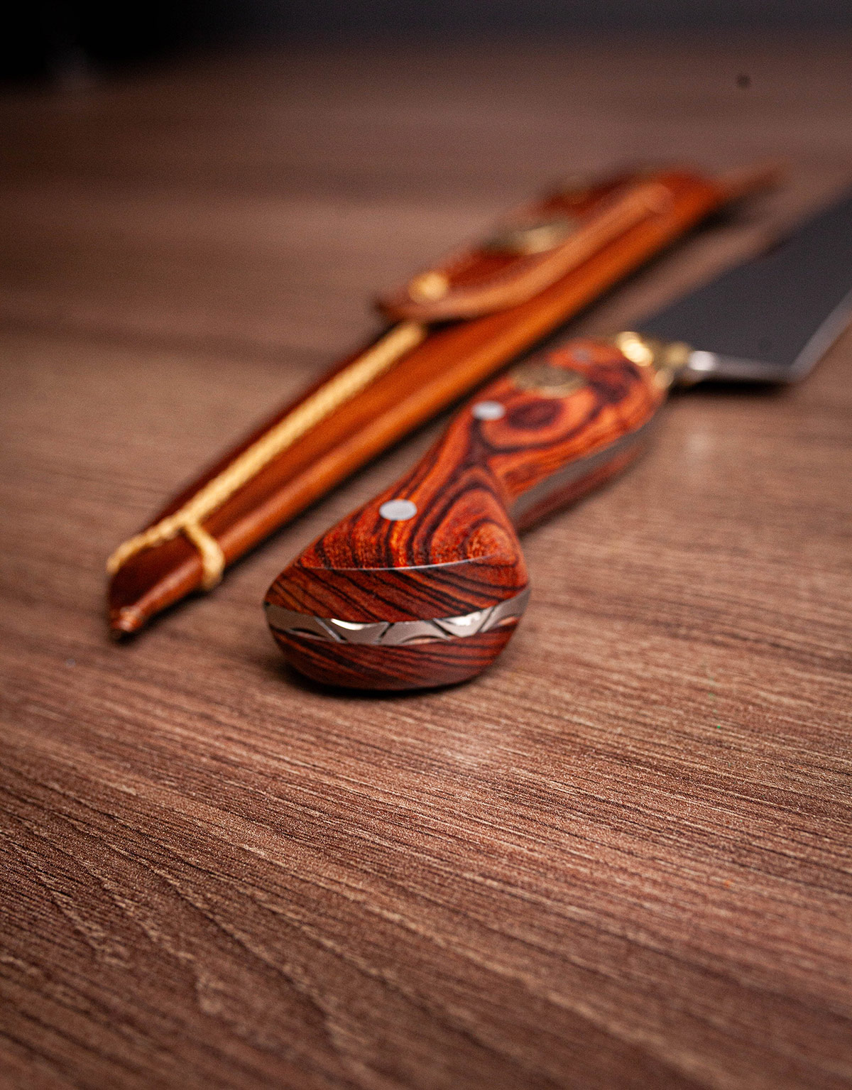 Acabamento espelhado, design Full Tang e cabo em Jacarandá. Elegância, resistência e brilho superior.