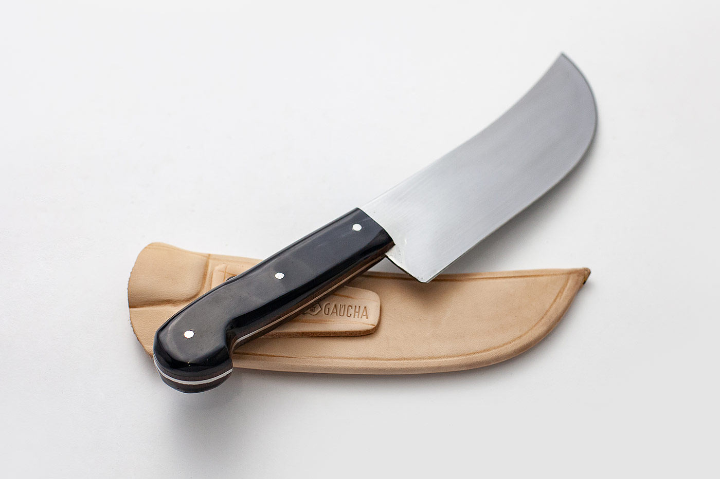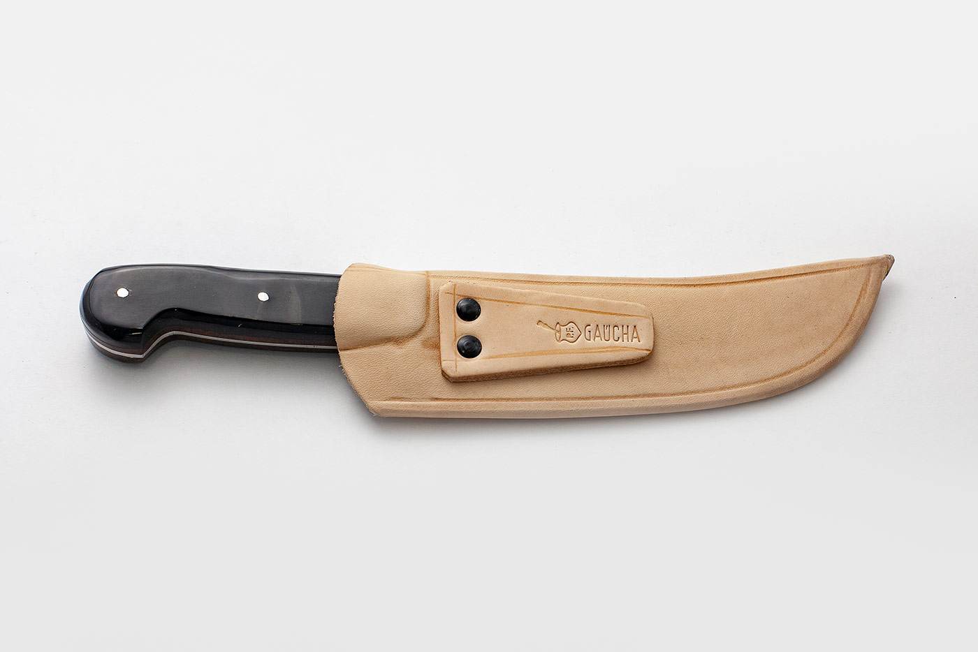 Faca Correadeira em aço carbono com cabo de chifre e bainha em couro