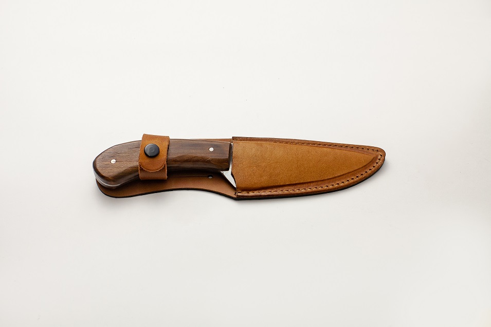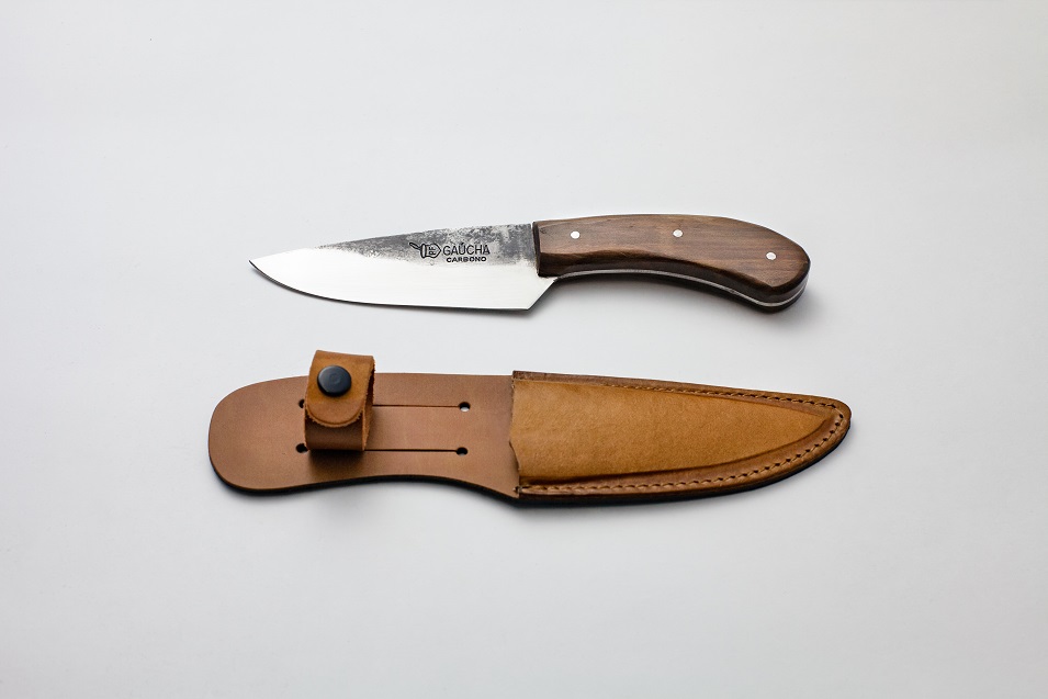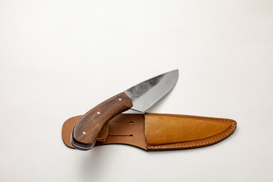 Faca em aço carbono rústica com cabo de madeira e bainha em couro