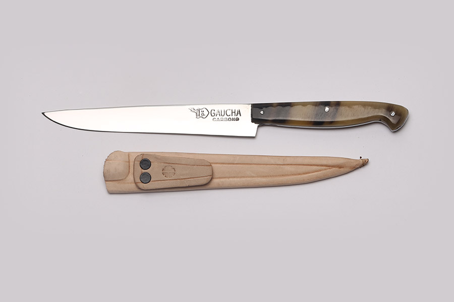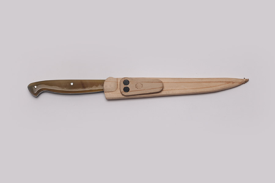 Faca Peixeira em aço carbono com cabo de chifre e bainha em couro