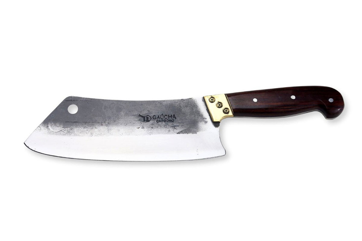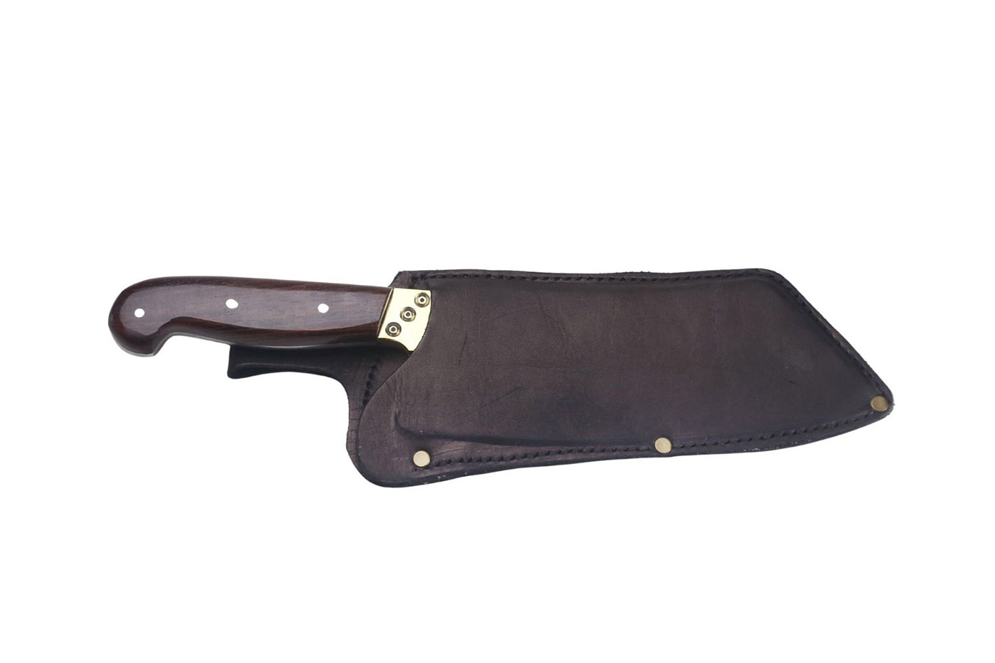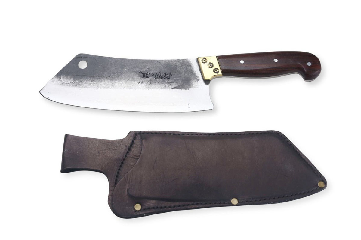 Cutelo em carbono 3,75 mm de espessura com cabo de madeira, metal e bainha em couro.