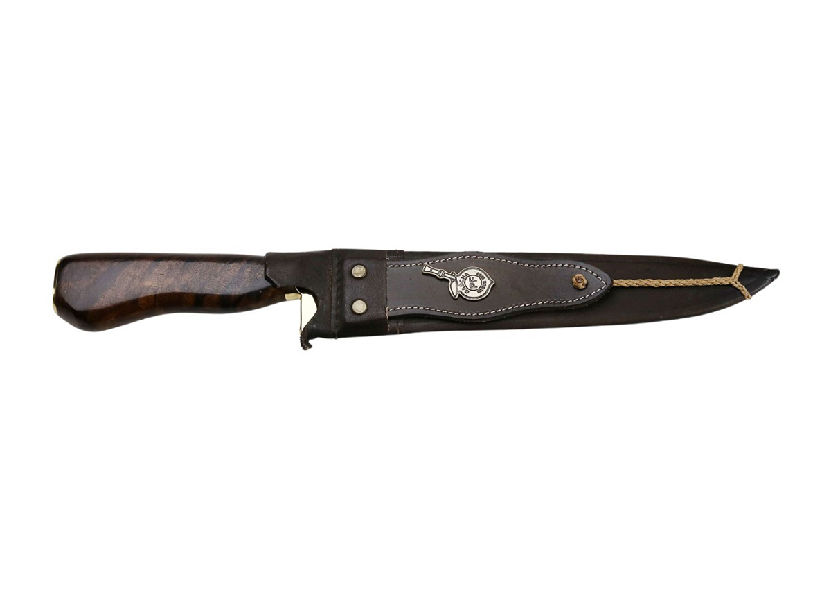 Faca em aço carbono fosfatizada 3,75 mm de espessura com cabo de madeira e metal e bainha em couro