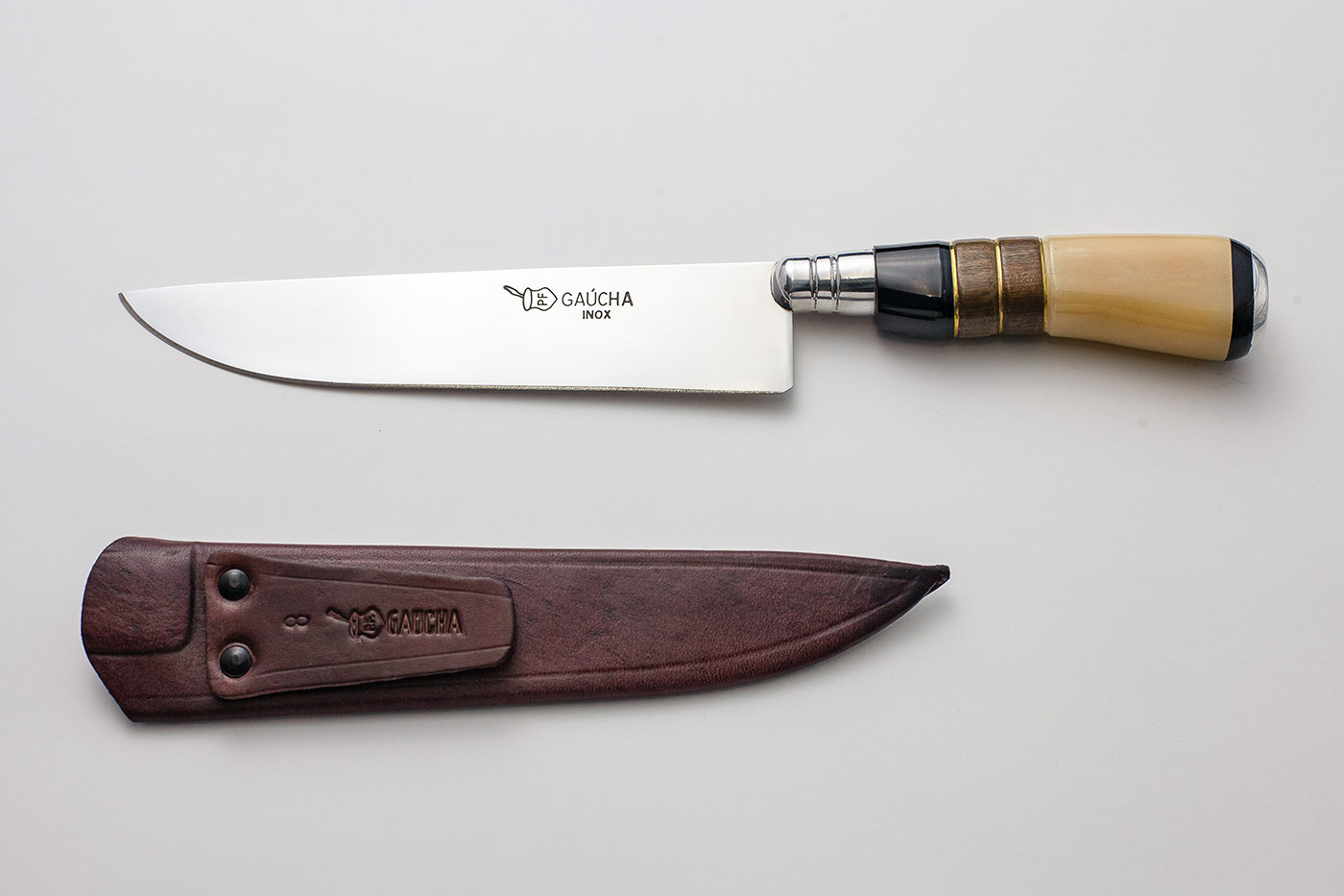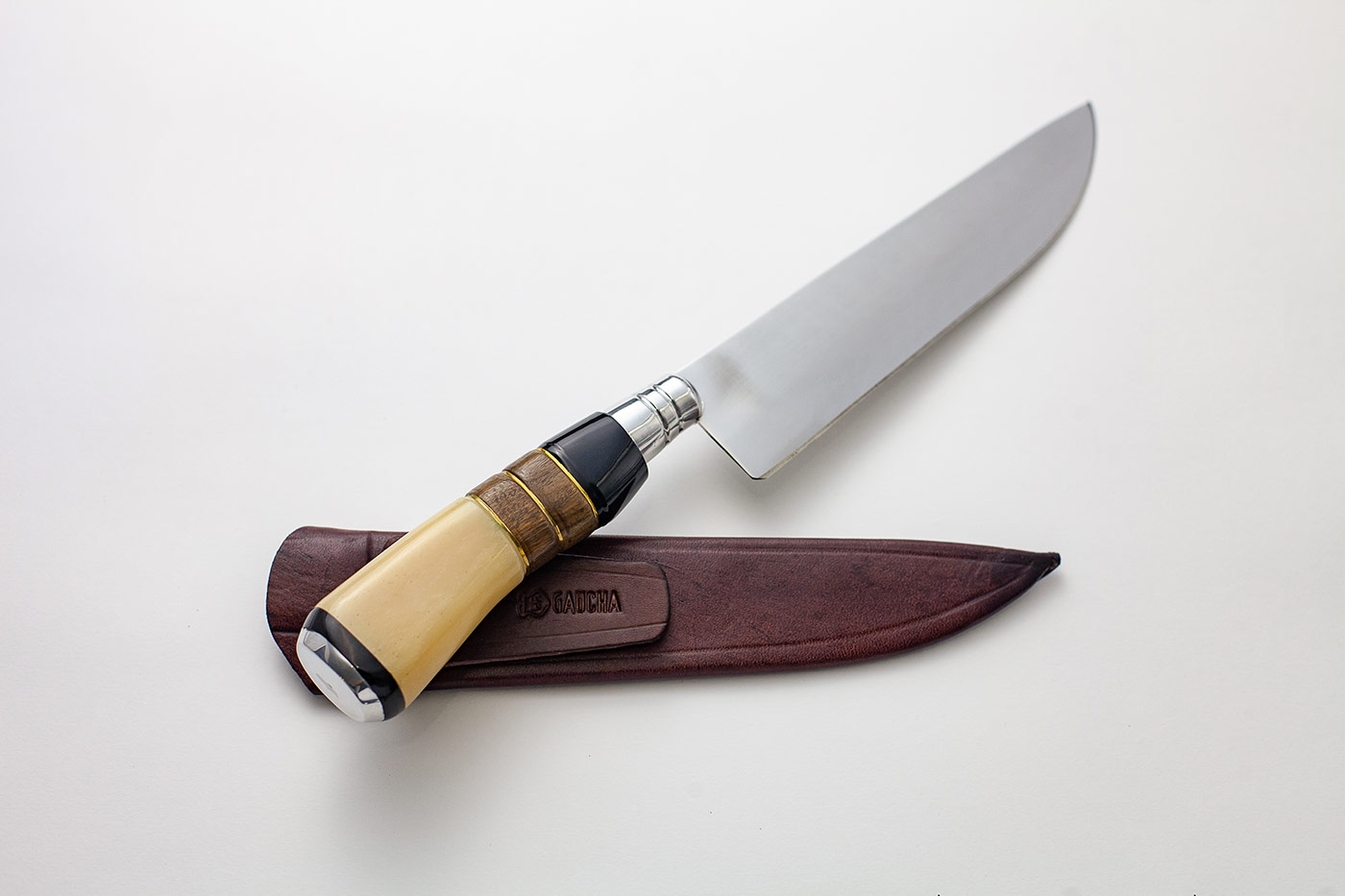 Faca em aço inox cabo de osso, madeira e chifre e bainha em couro