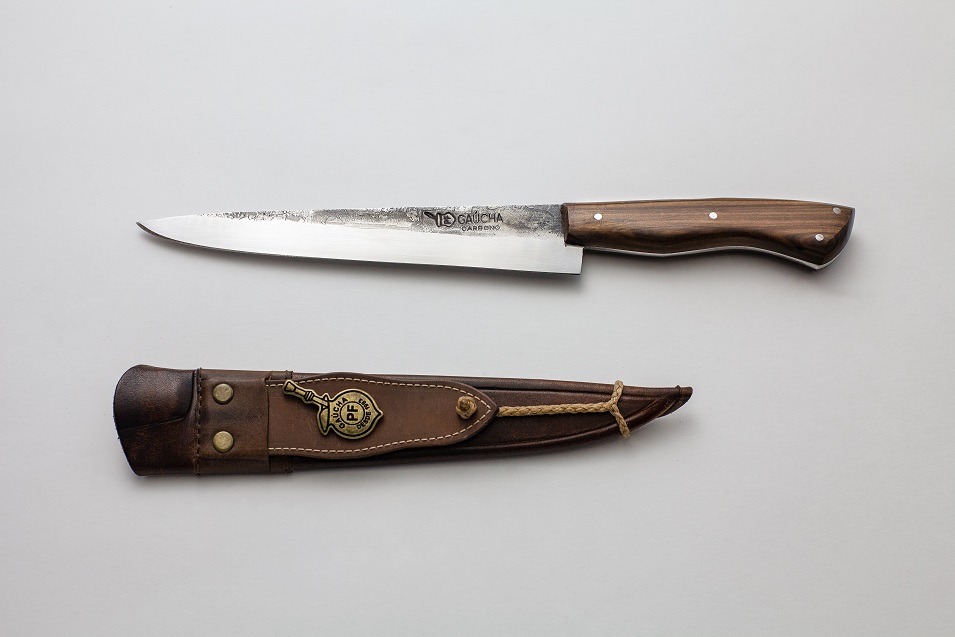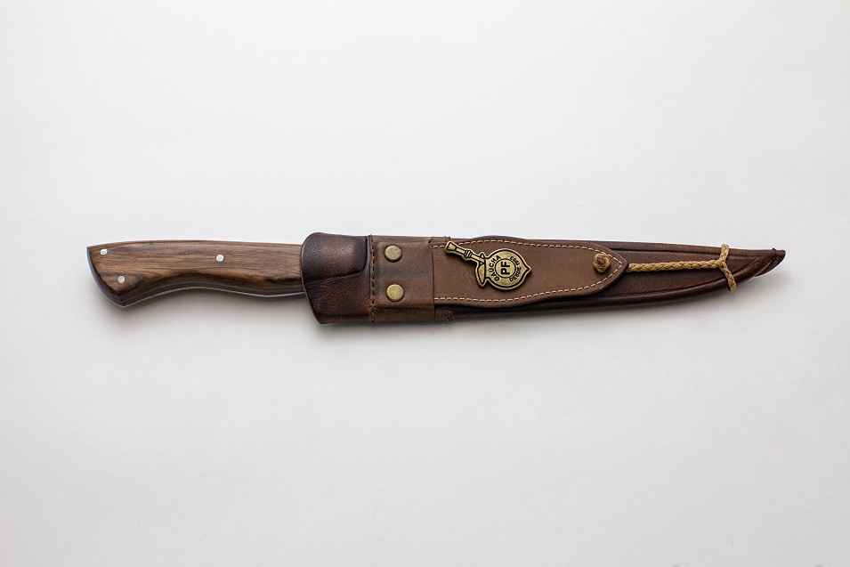 Faca em aço carbono 2,65 mm de espessura com cabo de madeira e bainha em couro