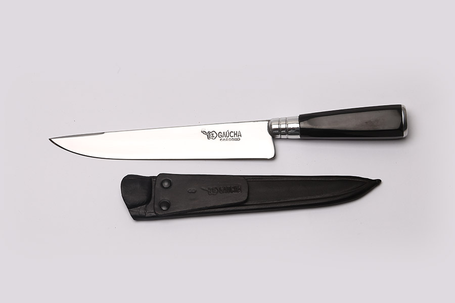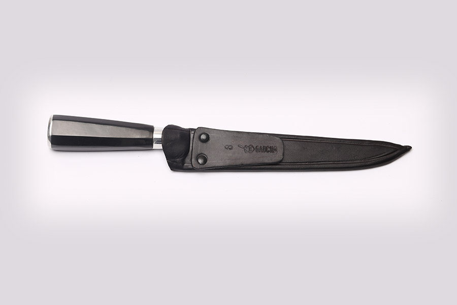 Faca em aço carbono 3,75 mm de espessura com cabo de chifre oitavado e bainha em couro