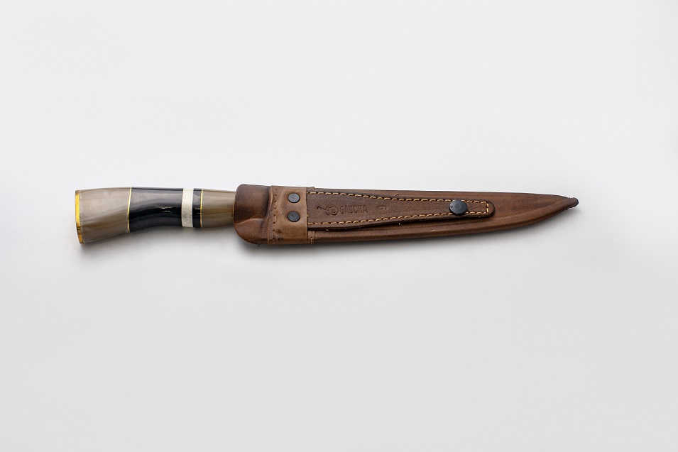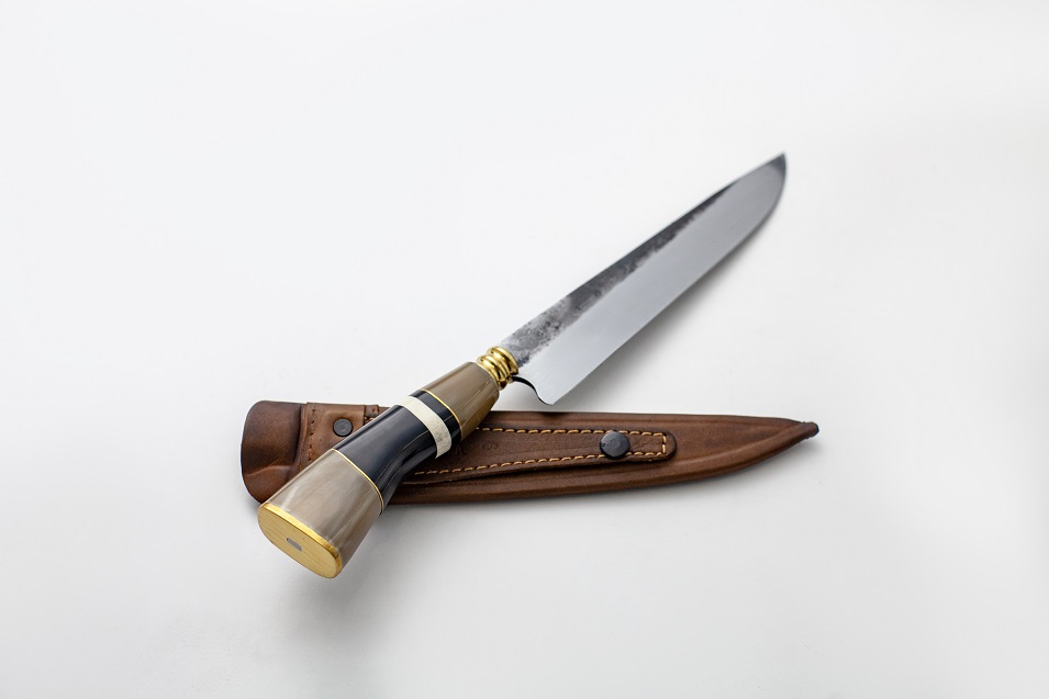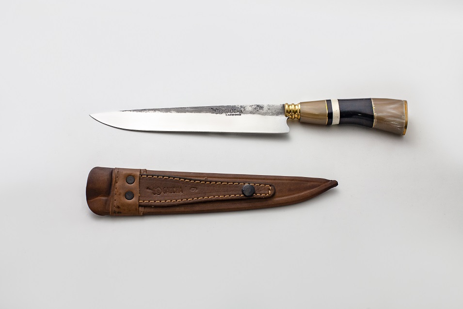 Faca em aço carbono rústica com cabo trabalhado e bainha em couro