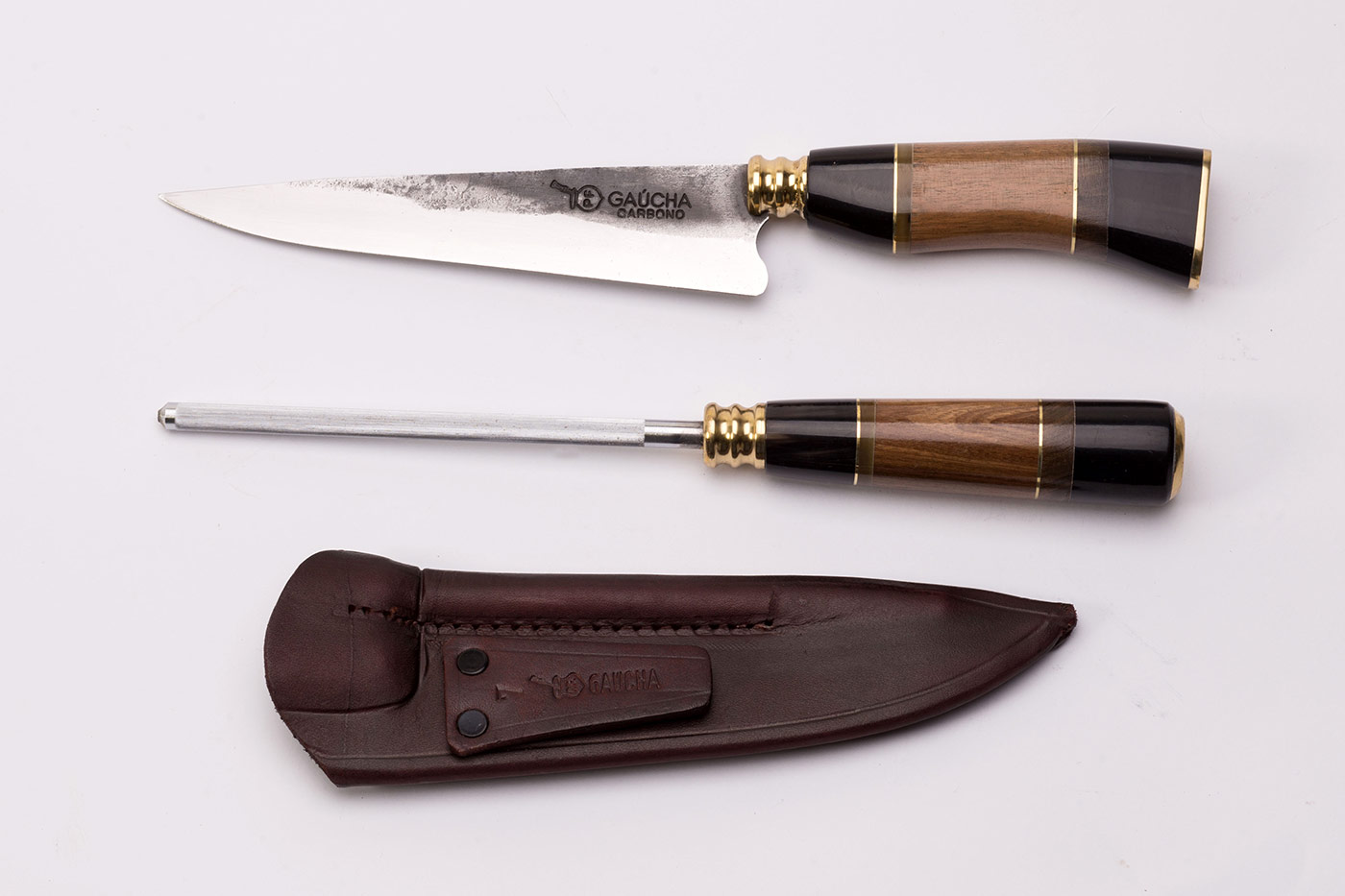 Conjunto com chaira e faca em aço carbono rústico com cabo trabalhado e bainha em couro