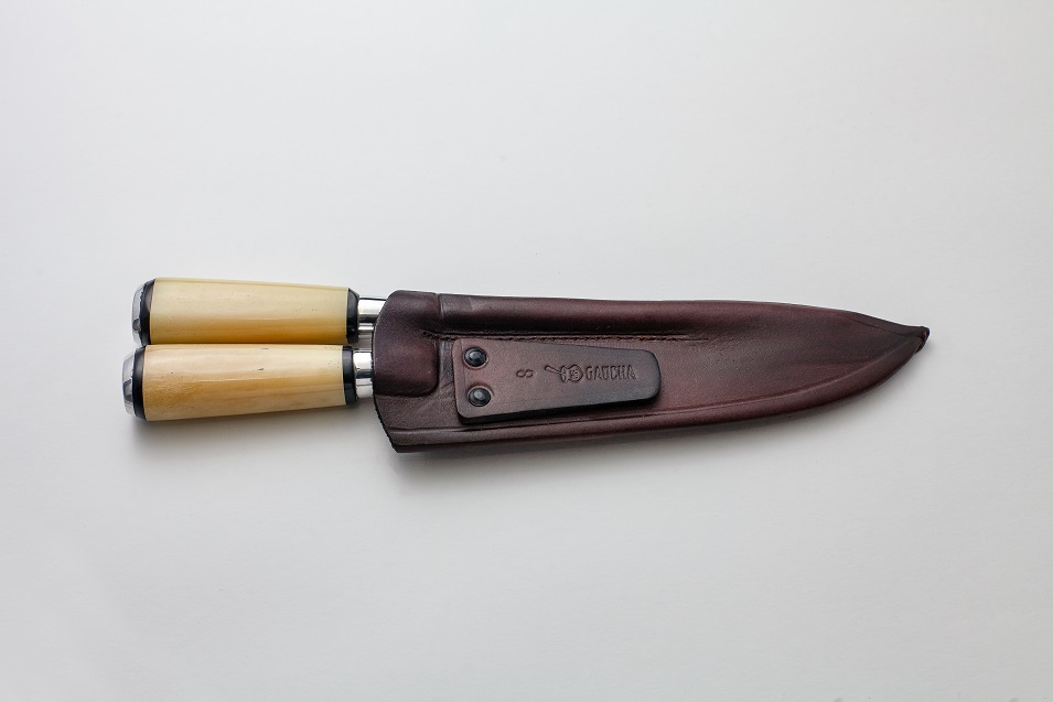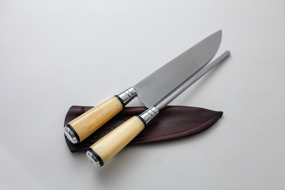 Conjunto com chaira e faca em aço inox com cabo de osso oval e bainha em couro.