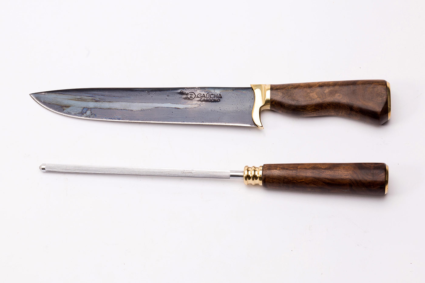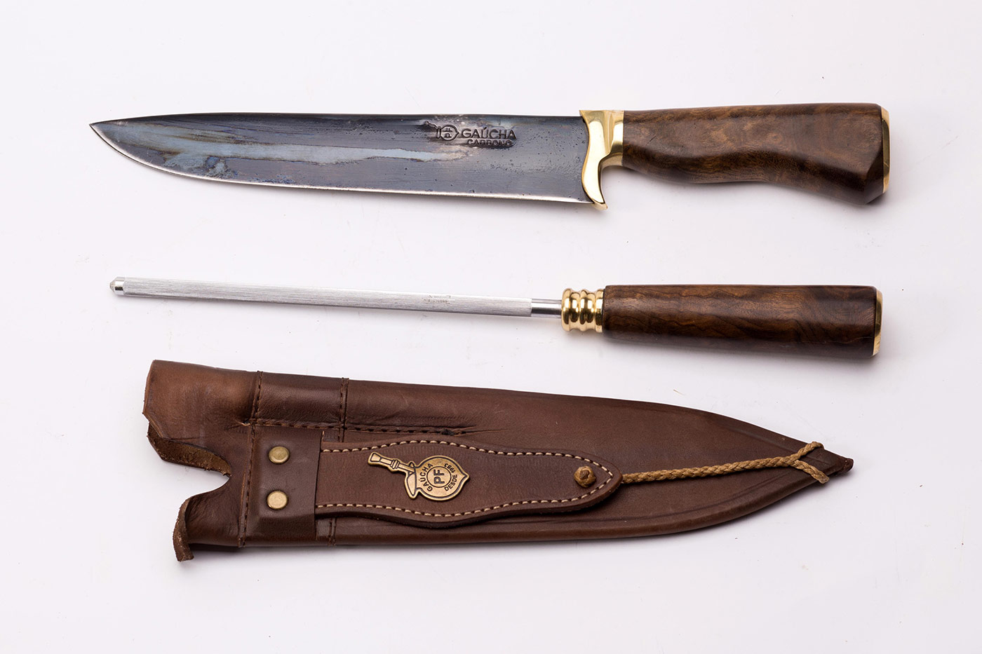 Conjunto com chaira e faca em aço carbono fosfatizado com cabo de madeira e bainha em couro
