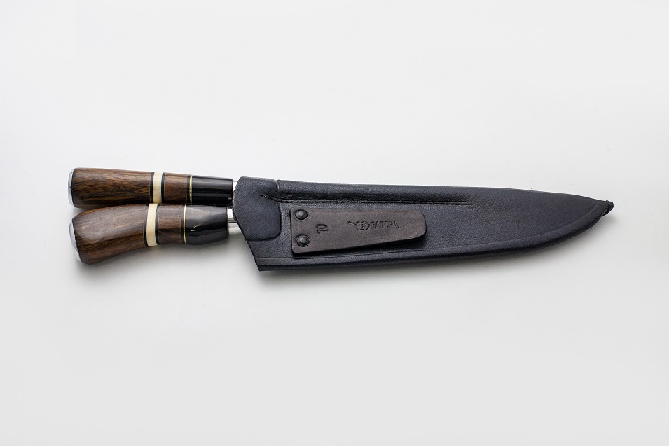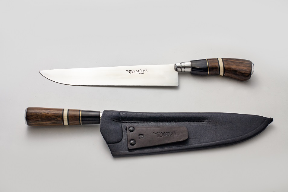 Conjunto com chaira e faca em aço inox com cabo de madeira e chifre e bainha em couro