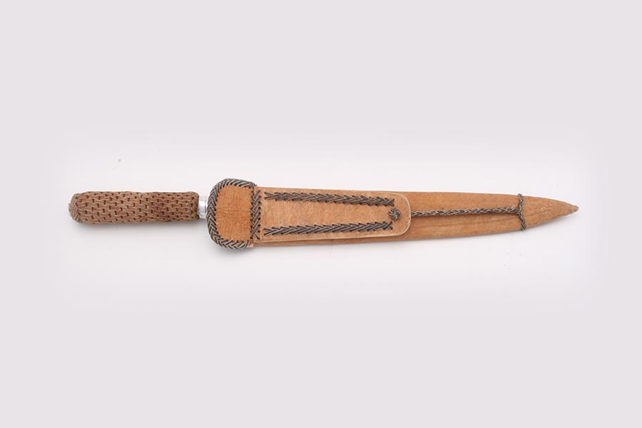 Descrição: Faca em aço carbono 3,75 mm de espessura com cabo e bainha em couro cru trançado